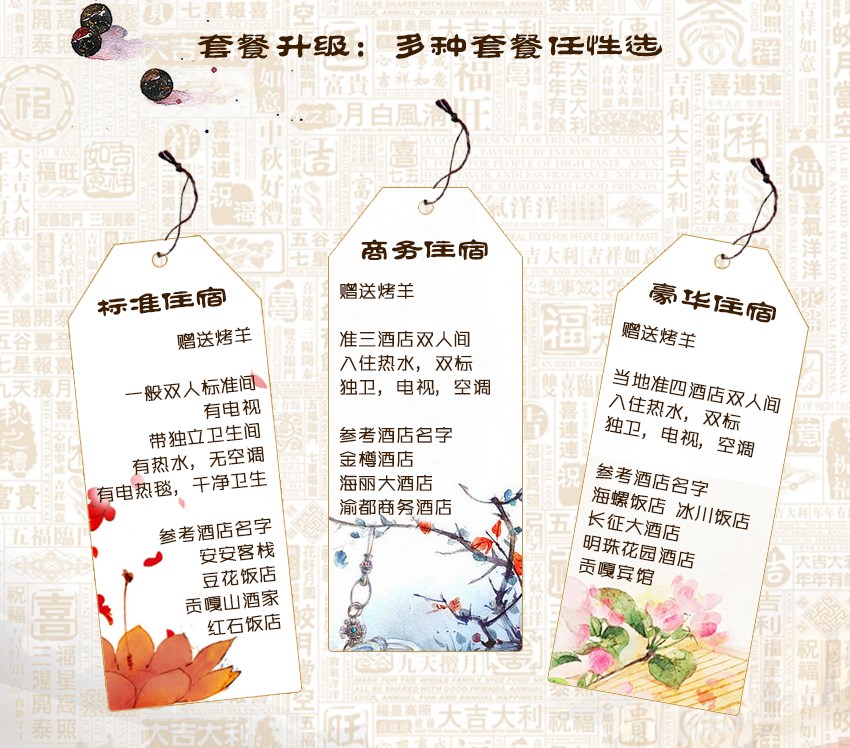 套餐二住宿商务等:当地准三酒店双人间:入住热水,双标,独卫,电视,空调;(参考酒店名字:金樽酒店、海丽大酒店、渝都商务酒店)赠送烤羊。