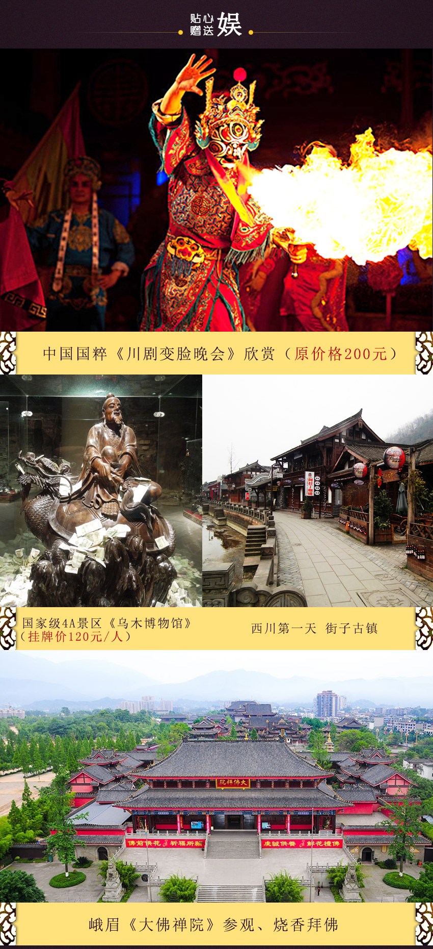 赠送:中国国粹《川剧变脸晚会》国家级AAAA景区 《乌木博物馆》 大佛禅院 赠送项目不去费用不退!