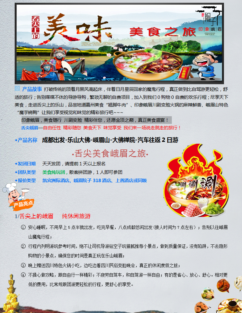 1、此行程为我社纯玩行程,行程内除了有新赠景点以外我社导游不安排任何购物项目。(乐山、峨眉山是佛教圣地景区内有很多宗教场所和贩卖当地特产的小贩,游客在景区以内参加的宗教活动和自行购买的商品我社不承担任何责任)。