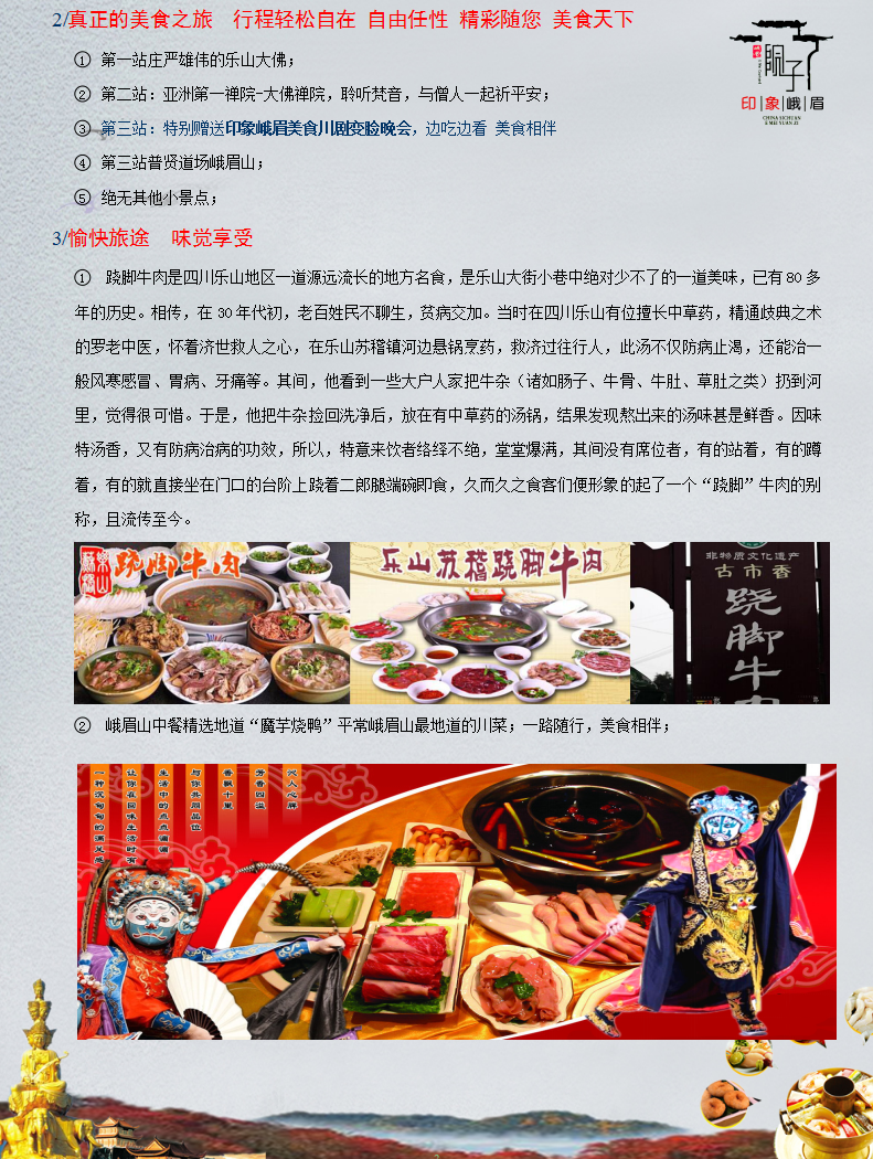 ♦ 峨眉变脸功夫晚会介绍(参考价180元/人>赠送)印象峨眉美食川剧变脸晚会-让您品尝四川火锅的麻,辣,鲜,香辅以四川特色名小吃的同时观看印象峨眉集川剧变脸、峨眉武术、欢乐彝家等绝技60分钟的演出,晚会气势恢宏地再现了仙山峨眉千万年的历史沧桑和文化积淀。让您在边吃边看中欣赏富有浓郁乡土特色的技艺表演中,品味四川独特的民俗风情,于静逸中再现峨眉山水的秀美绝伦,于淡雅中享受旅游美食文化带来的乐趣!