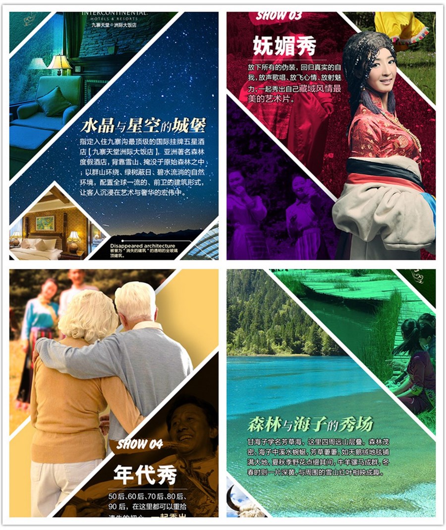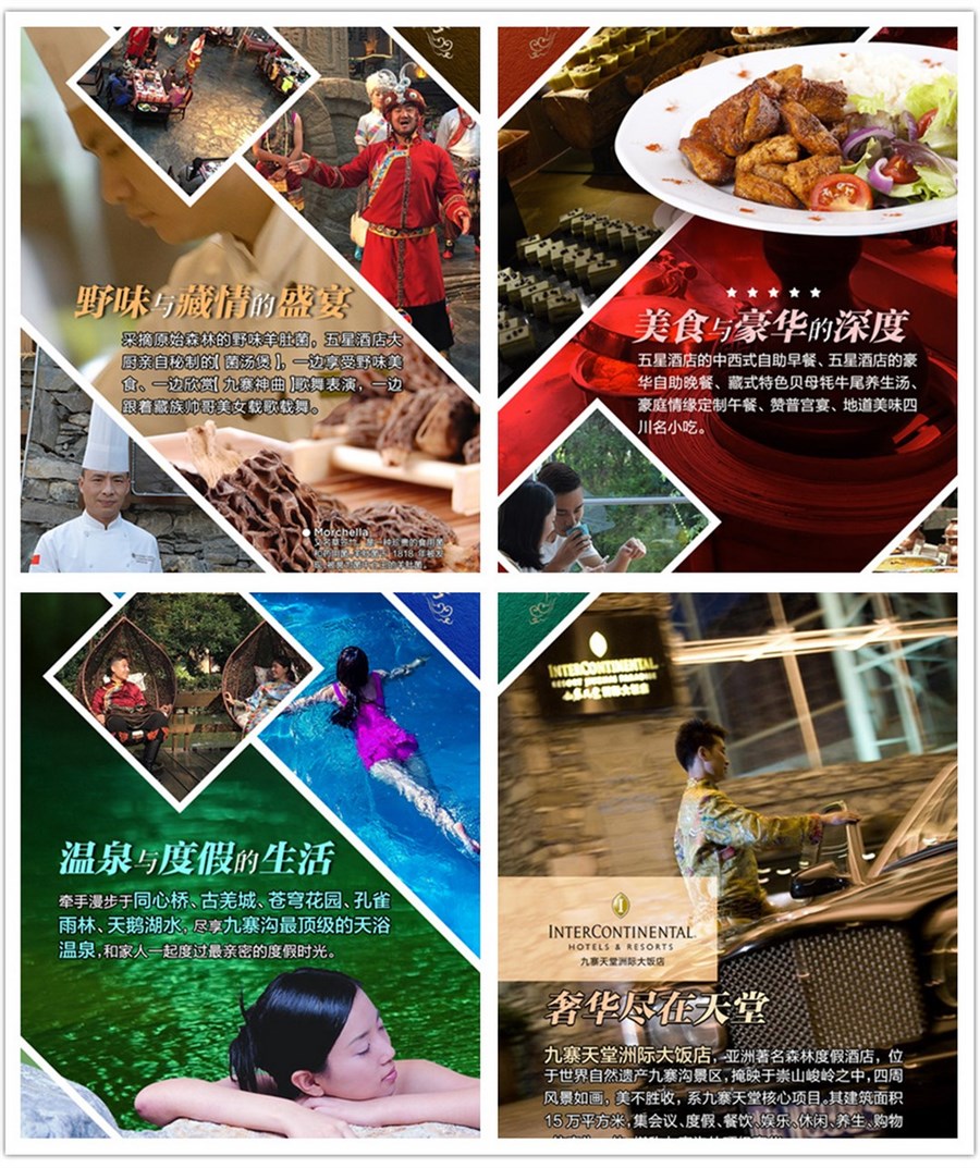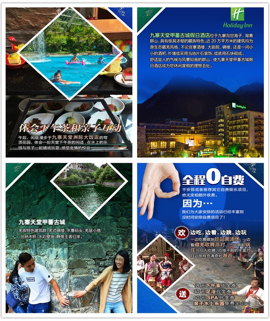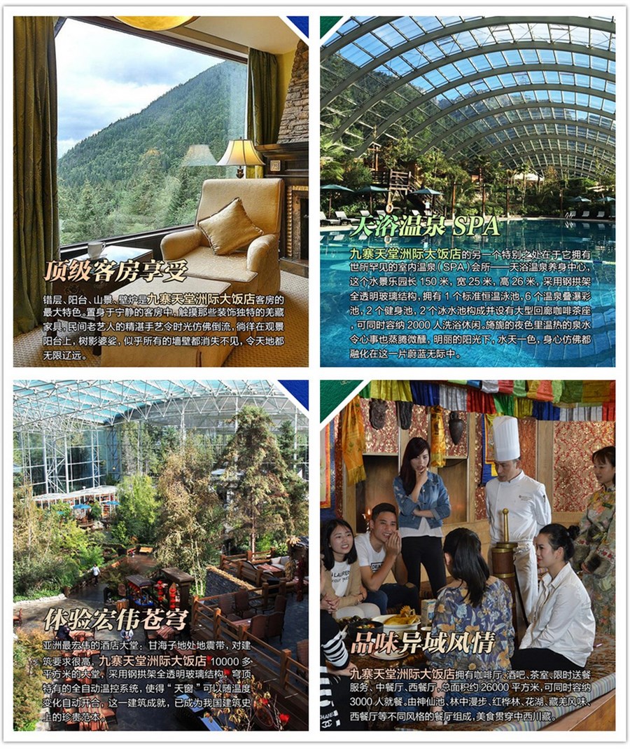 ♦ 【九寨神曲】九寨天堂洲际大饭店的古羌寨广场,位于全亚洲最宏伟的酒店大堂内,10000多平方米的大堂,采用钢拱架全透明玻璃结构,穹顶特有的全自动温 控系统,使得“天窗”可以随温度变化自动开合,这一建筑成就,已成为我国建筑史上的珍贵范本。星空之下,天地之间,融入一次非凡的文化体验,浓郁的藏羌风 情,奔放的音乐舞蹈,华丽的民族服饰,原生态的古朴民俗,再现九寨神奇与壮美。九寨天堂洲际大饭店歌舞团的演员们,拥有一段无人与之匹敌的履历:他们中的 所有人,都参与过《九寨天堂 梦幻之旅》大型超时空场景歌舞剧的演出,而这场演出由2008年北京亚运会副总导演陈维亚率专业团队与九寨天堂艺术团共同打造,是一部国际化、史诗性的经 典舞台巨制,多次荣登央视,凤凰卫视的舞台。
