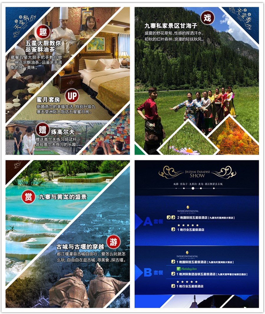 住宿:1晚九寨天堂洲际大饭店 1晚甲蕃古城假日酒店 1晚茂县凤凰阁大酒店或茂县国际饭店