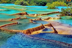 ♦ 【黄龙】黄龙的海拨较高,约3145-3578米,以其雄、峻、奇、野风景特色,享有“世界奇观”、“人间瑶池”的美誉。池水映出各种不同的色彩,五光十 色,争奇斗妍;浅滩上水流涌动,阳光照射,波光粼粼,晶莹透亮;水下铺垫着一层细细的浅黄色苔藓,涉足滩流,倍感柔软清凉,此时此地,恍若进入瑶池仙境。