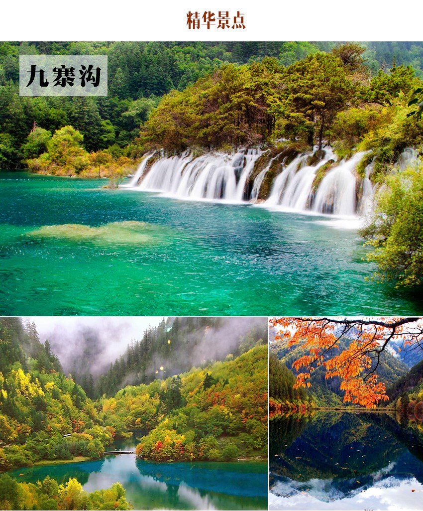 1.九寨沟:九寨集翠海、叠溪、彩林、雪峰和藏族风情于一体,其自成天成、美丽绝伦的自然风光闻名于世。蓝天、白云、雪山、森林、尽融于瀑、河、滩、缀成一串串宛若从天而降的珍珠;其分为则查洼沟、日则沟、树正沟三条沟,呈“丫”字分布;整个构成了一个五彩斑谰、神奇梦幻的人间仙境,一个不见纤尘、自然纯净的“童话世界”。