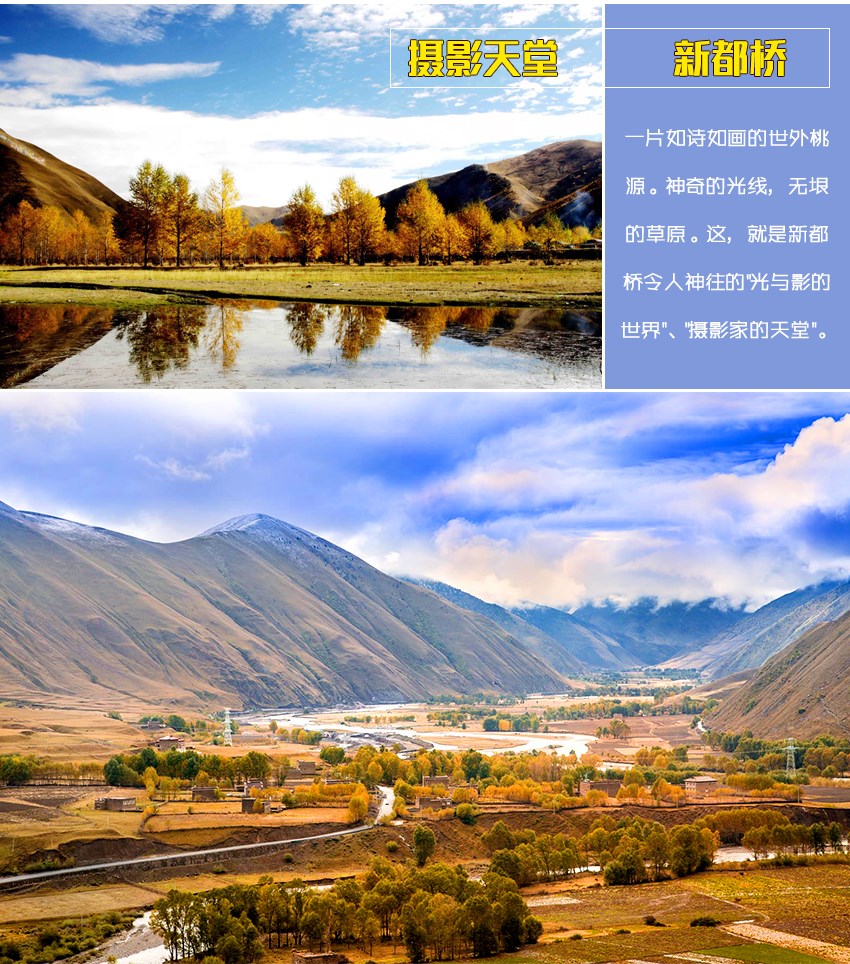 车至‘菩萨喜欢的地方——塔公,可观赏藏区特色草原—【塔公草原】风光,感受浓郁的藏族喇嘛教风情,眺望终年积雪的雅拉神山(又名木雅神山)。后可朝拜康区“大昭寺”—【塔公寺】(自理20元/人),释迦牟尼12岁等神像,观看文成公主所发明的藏区独特的酥油花,带着信念转动寄托幸福的经桶,感受不远千里带着信仰而来朝拜的信徒所特有的那种坚定的信念与虔诚。 后经松林口河谷图腾抵达摄影天堂——【新都桥】(新都桥镇在国道318川藏线南北岔路口,有一片如诗如画的世外桃源。神奇的光线,无垠的草原,弯弯的小溪,金黄的柏杨,连绵起伏的山峦,错落有致的藏寨,星星点点的牛羊……是令人神往的“光与影的世界”、“摄影家的天堂),晚入住新都桥酒店;