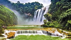 【黄果树大瀑布】它位于安顺市镇宁布依族苗族自治县,古称白水河瀑布,亦名"黄葛墅"瀑布或"黄桷树"瀑布,因本地广泛分布着"黄葛榕"而得名。为黄果树瀑布群中规模最大的一级瀑布,是世界著名大瀑布之一。以水势浩大著称。瀑布高度为77.8米,其中主瀑高67米;瀑布宽101米,其中主瀑顶宽83.3米。黄果树瀑布属喀斯特地貌中的侵蚀裂典型瀑布。(2小时)