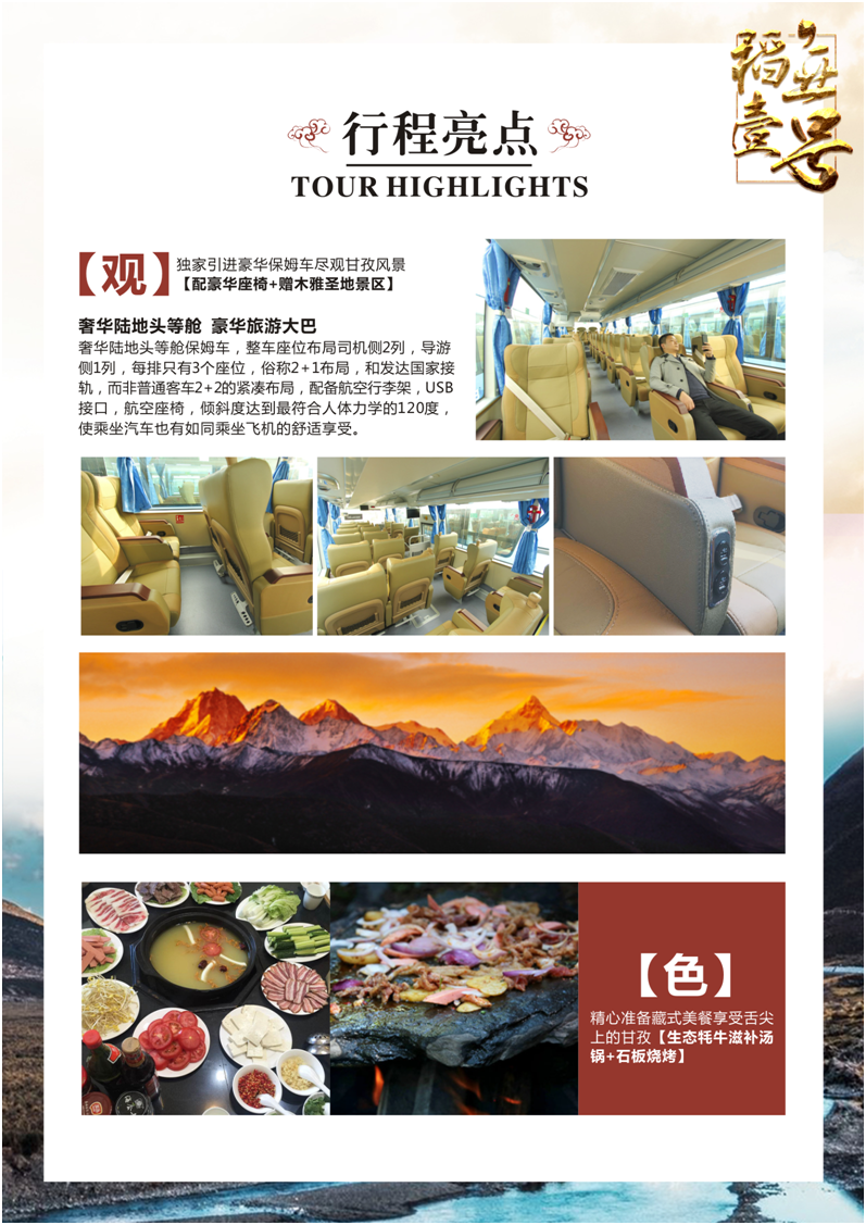 【地面交通】:奢华陆地头等舱保姆车,整车座位布局司机侧2列,导游侧1列,每排只有3个座位,俗称2+1布局,和发达国家接轨,而非普通客车2+2的紧凑布局,配备航空行李架,USB接口,航空座椅,倾斜度达到最符合人体力学的120度,使乘坐汽车也有如同乘坐飞机的舒适享受。