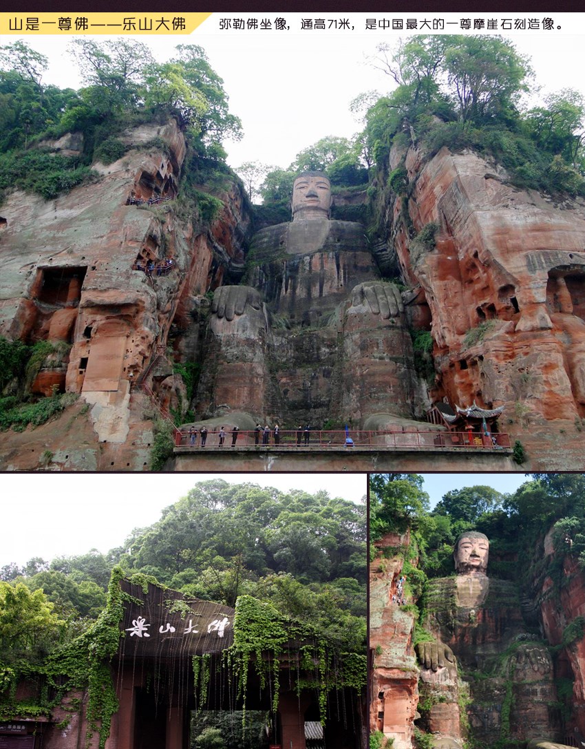 大佛开凿于唐玄宗开元初年,历时90年才告完成,佛像高71米,比号称世界最大的阿富汗米昂大佛(高53米)高出18米,是名副其实的世界之最,素有“佛是一座山,山是一座佛”之称。